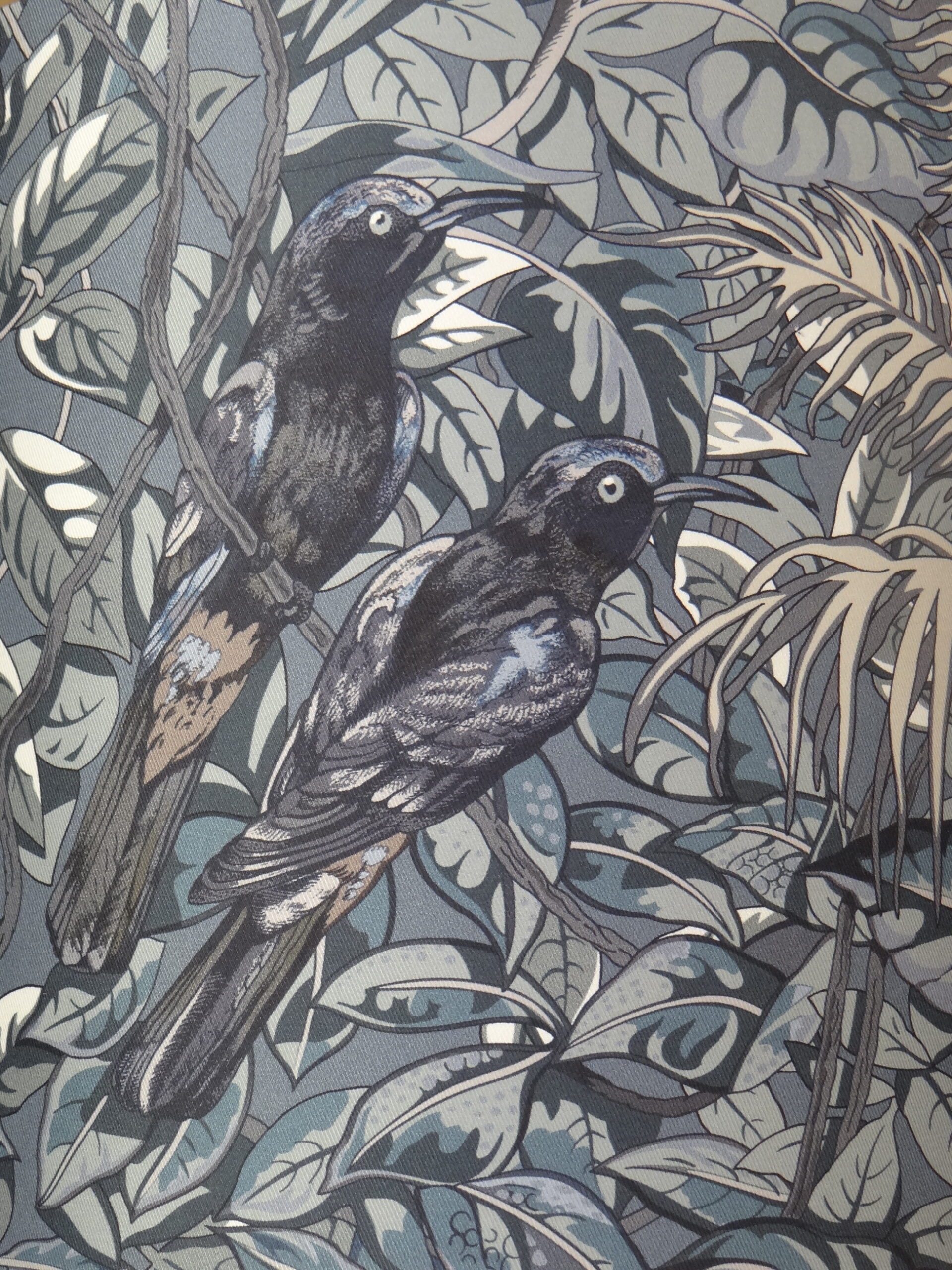 Le décor, inspiré de l’univers naturaliste, représente une scène foisonnante de feuillages et d’oiseaux exotiques. Le fond dense de végétation se compose d’une multitude de feuilles stylisées, entrelacées les unes aux autres, dans une palette chromatique dominée par des tons de bleu, de gris et de vert sourd. Ces teintes froides et profondes créent une atmosphère apaisante, presque onirique, qui évoque les jungles mystérieuses et luxuriantes. Parmi ce feuillage dense, deux oiseaux majestueux se détachent avec grâce. Leurs silhouettes noires aux reflets bleutés sont minutieusement travaillées : chaque plume est rendue avec un sens aigu du détail, témoignant de la précision graphique propre aux carrés de soie Hermès.