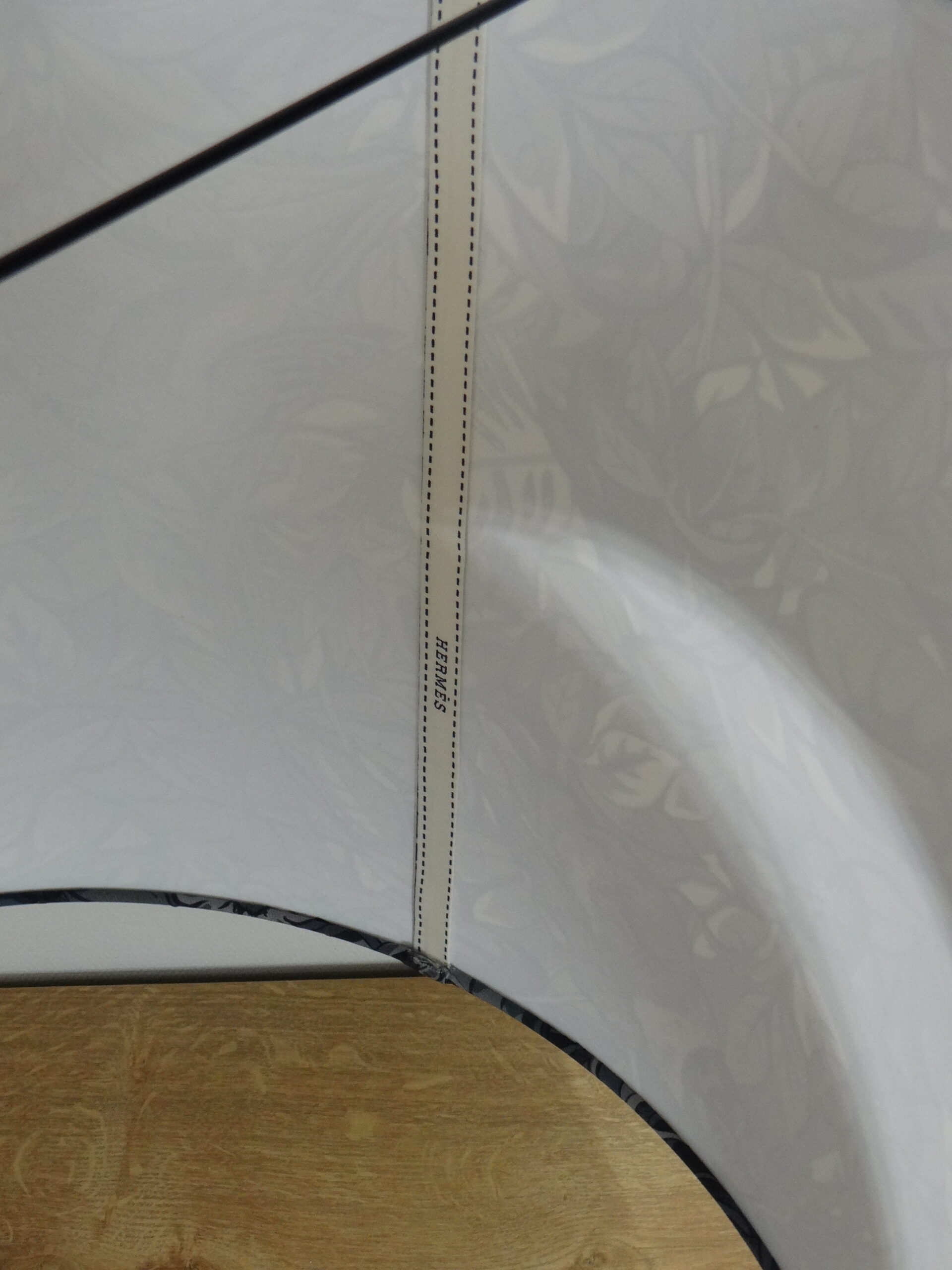 Le choix du twill de soie comme matière principale confère à l’abat-jour un aspect luxueux et délicat. Cette étoffe, emblématique de la maison Hermès, est réputée pour son toucher doux et satiné, ainsi que pour la profondeur qu’elle donne aux impressions. Sur cette surface, les couleurs gagnent en intensité, et les nuances se déploient avec une finesse inégalée. Le rendu soyeux apporte également une dimension sensorielle : la lumière filtrée à travers la soie prend une qualité particulière, douce et diffuse, enveloppant la pièce d’une clarté élégante et tamisée. De jour comme de nuit, l’abat-jour se transforme ainsi en un objet vivant, modulant son apparence au gré de l’éclairage.