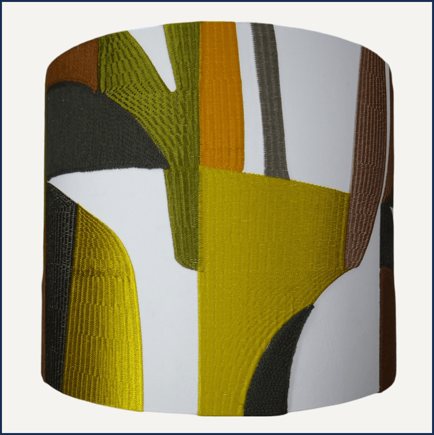 Cet abat-jour très moderne est confectionné avec un tissu Casamance de style Art Déco. Les motifs géométriques sont brodés avec des fils de laine et de viscose sur un satin de coton blanc. Cet abat-jour multicolore apportera une touche très décorative à votre intérieur. Cet abat-jour contrecollé d’un polyphane blanc projette une lueur chaleureuse et une lumière tamisée. Cet abat-jour peut-être utilisé en suspension ou pour embellir un pied de lampe avec une douille E27 ou E14 en ajoutant un réducteur.