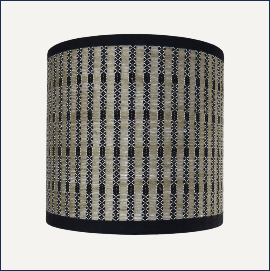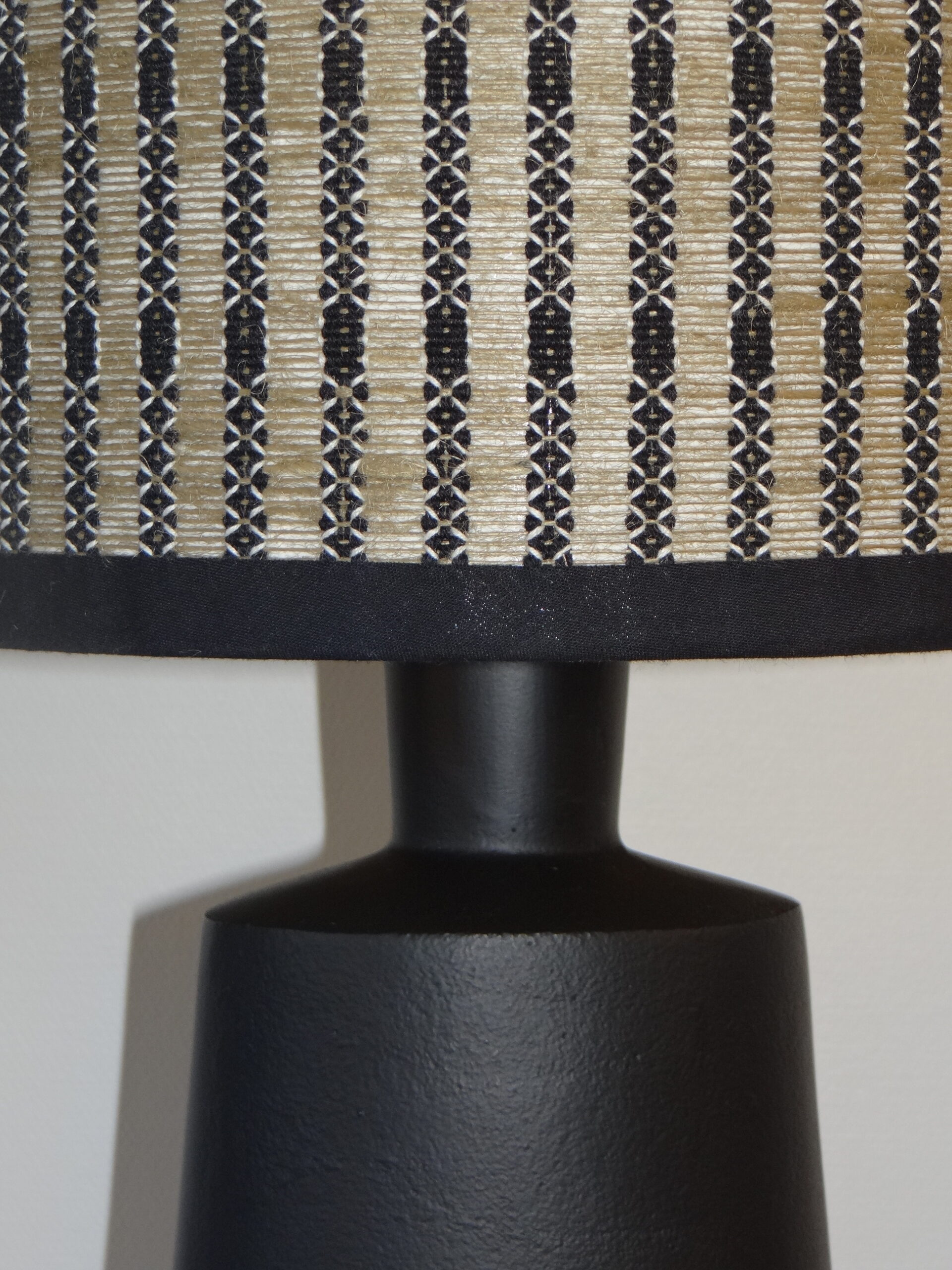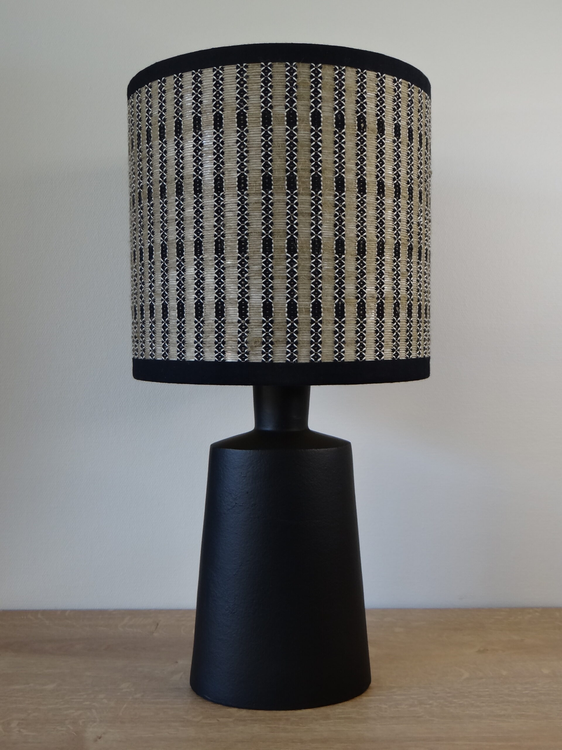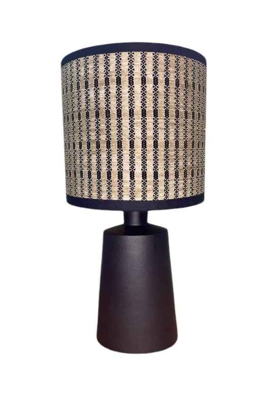 L’esthétique de cet abat-jour repose sur un tissage complexe qui mélange des nuances naturelles de beige et de noir. Ce jeu de contrastes crée un motif géométrique régulier, à la fois structuré et raffiné. L’entrelacement des fils confère une impression de relief et de profondeur, accentuant son caractère authentique et chaleureux.
