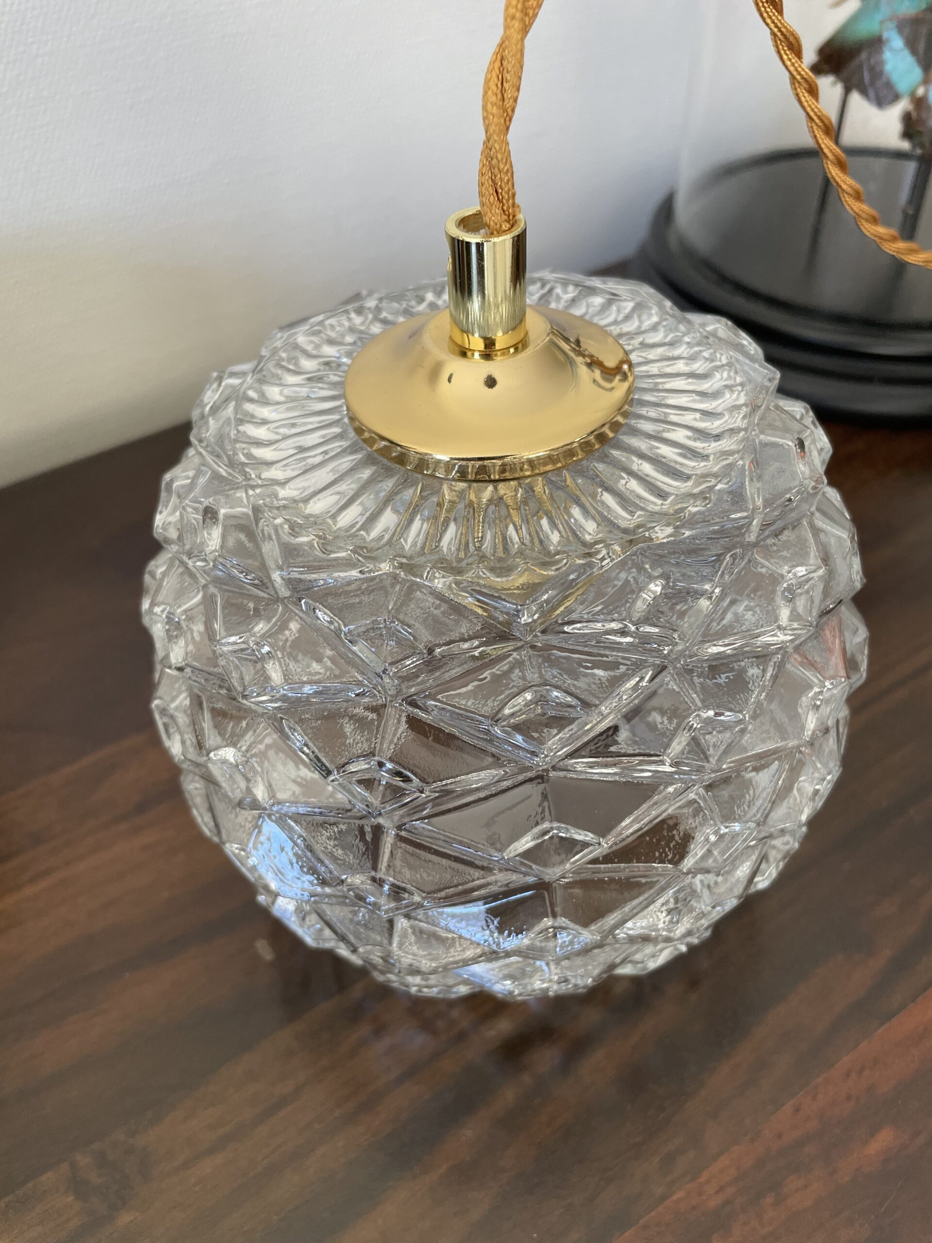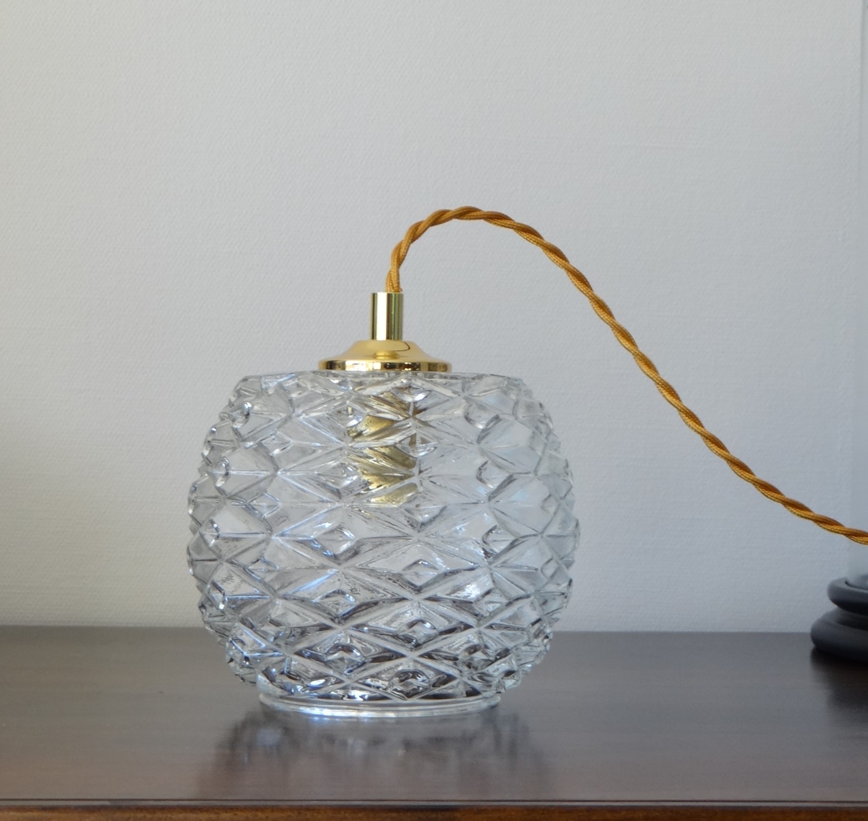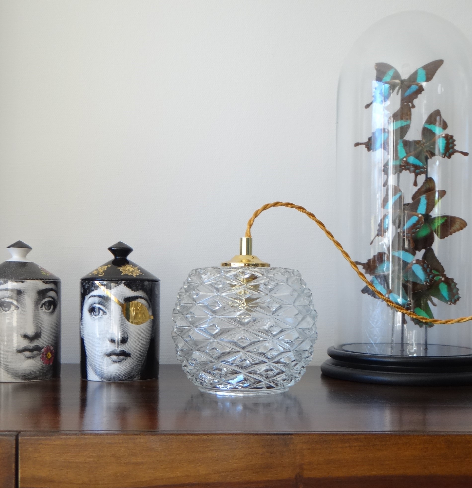 Lampe baladeuse réalisée avec un globe ancien des années 60 en forme d’ananas et d’un habillage en métal doré brillant.